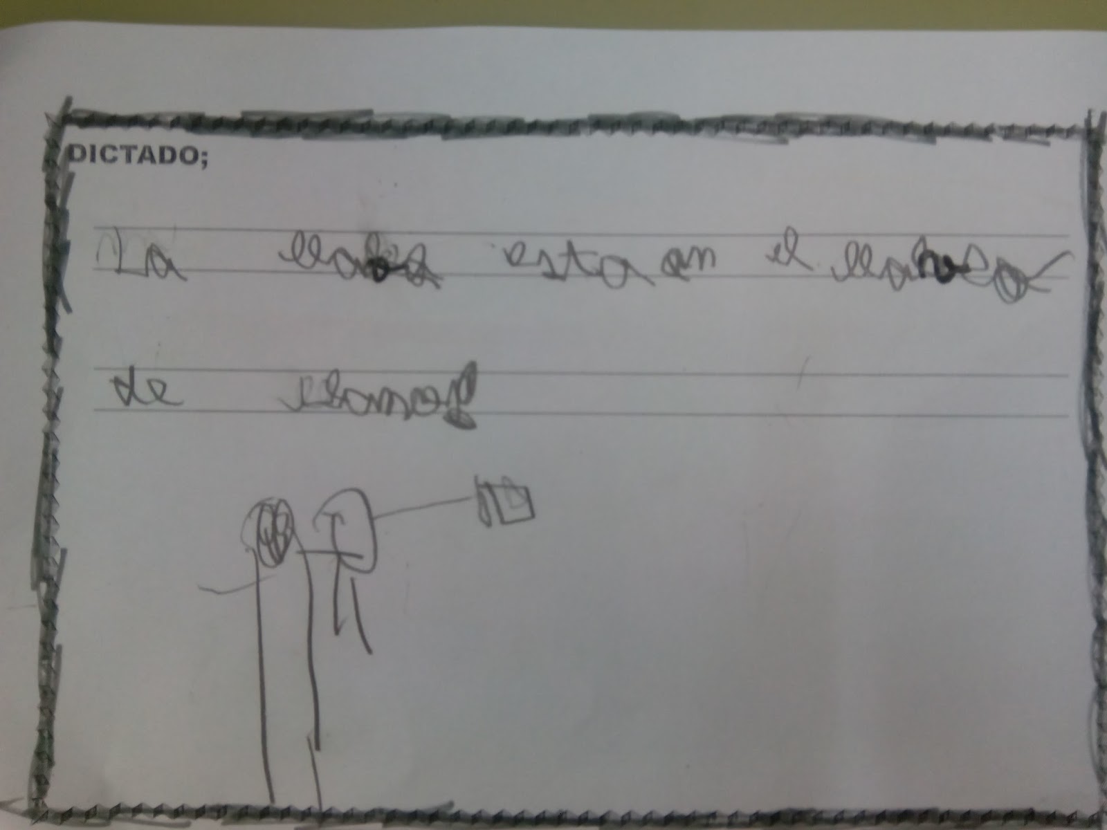 Continuamos haciendo dictados; dicto una frase pero para que entiendan que entre una palabra y otra hay que dejar un espacio sin escribir, digo una palabra y marco el espacio con un silencio y así hasta terminar la frase. Voy repitiendo cada palabra de la frase que digo para que si alguno todavía le cuesta discriminar los fonemas de dicha palabra los escuche y escriba y al terminar de decir la frase la repito varias veces por si alguien se ha perdido o le falta alguna palabra por escribir. Finalmente hacen un dibujo de lo que dice la frase para que comprendan lo que han escrito.